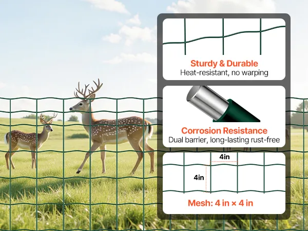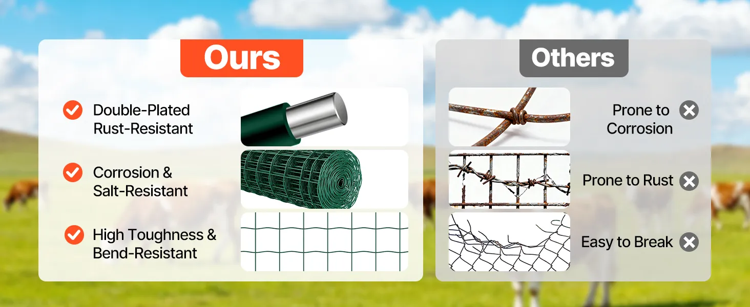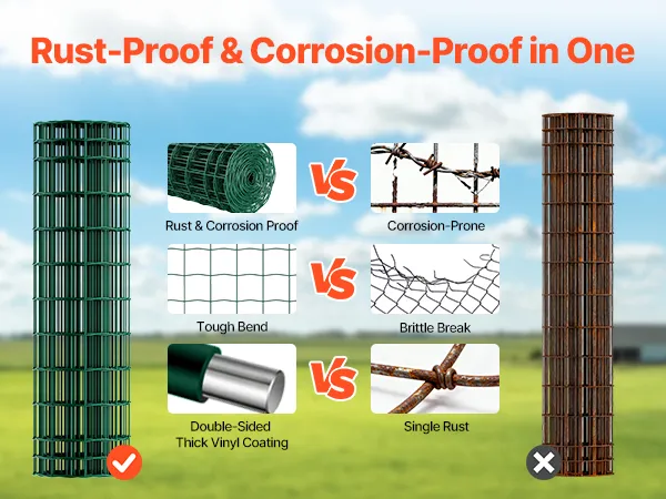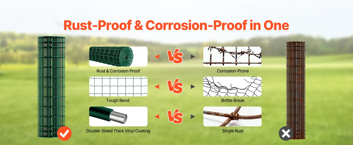 Wysokiej jakości powłoka: Wytrzymały, ocynkowany drut stalowy z wysokiej jakości, zieloną powłoką winylową. Siatka druciana w rolce zapewnia podwójną ochronę przed rdzą i zwiększoną odporność na warunki atmosferyczne, dzięki czemu ogrodzenie jest odporne na słońce i deszcz przez długi czas.