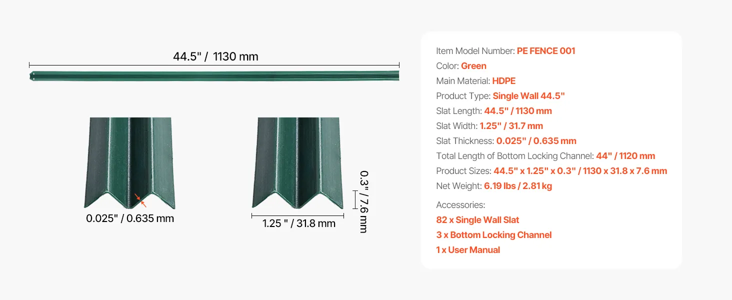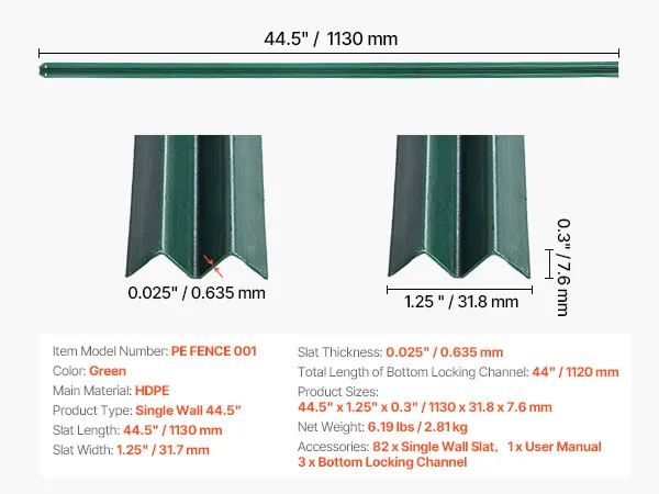 Pojedyncze listwy zapewniające prywatność: Te listwy zapewniające prywatność, blokowane w podłożu, zostały zaprojektowane specjalnie do ogrodzeń o wysokości 4 stóp i mają długość około 44,5 cala. Zapewniają idealne dopasowanie i zapobiegają wystawaniu listew ponad górną krawędź ogrodzenia.