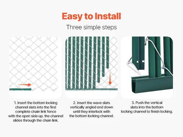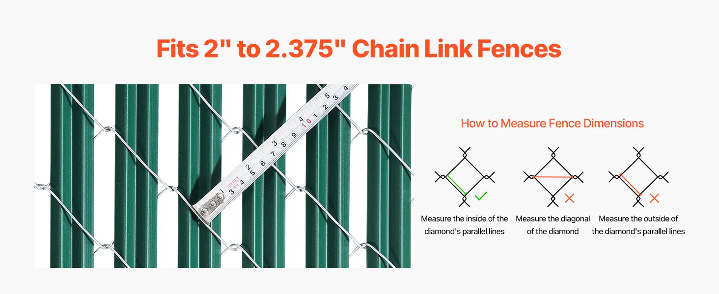 Większa prywatność: Możesz wybrać różne poziomy ochrony prywatności w zależności od swoich potrzeb. Ogniwo łańcucha o szerokości 2 cali zapewnia około 85% prywatności, ogniwo łańcucha o szerokości 2-1/4 cala zapewnia około 80% prywatności, a ogniwo łańcucha o szerokości 2-3/8 cala zapewnia około 75% prywatności. Przed złożeniem zamówienia należy dokładnie zmierzyć ogrodzenie z siatki łańcuchowej, aby dobrać odpowiednie szczeble.