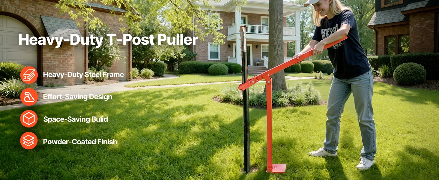 Solidna konstrukcja stalowa: Ten wyciągacz słupków T, wykonany ze wzmocnionej stali, wytrzymuje ciężar do 500 kg bez uginania się. Bez trudu radzi sobie z głęboko osadzonymi słupkami drewnianymi lub solidnymi metalowymi palikami, a powłoka proszkowa jest odporna na rdzę i zużycie, zapewniając długą żywotność.