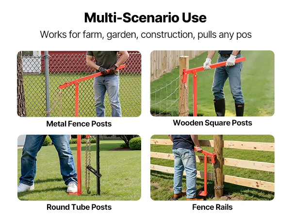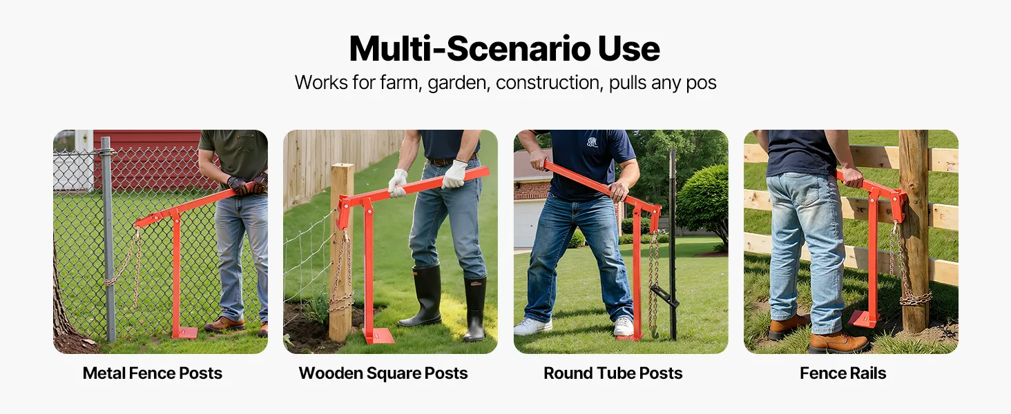 Ta szybka wyciągarka do słupków idealnie nadaje się do stosowania w gospodarstwach rolnych, ogrodach i na placach budowy, umożliwiając bezproblemowe wyciąganie metalowych słupków ogrodzeniowych, drewnianych i kwadratowych. Jedno narzędzie wykonuje wiele zadań bez użycia prądu, zapewniając wydajną i wygodną obsługę.
