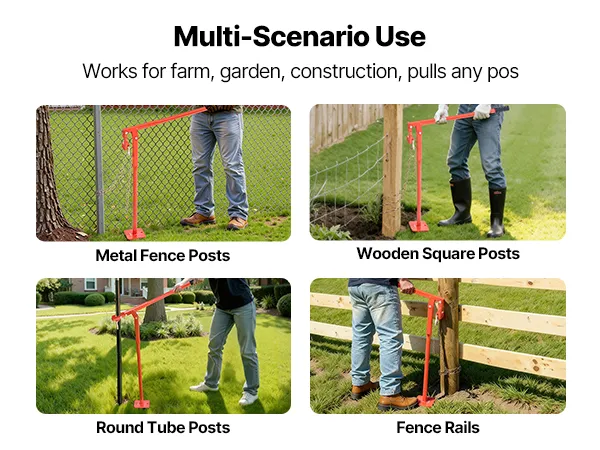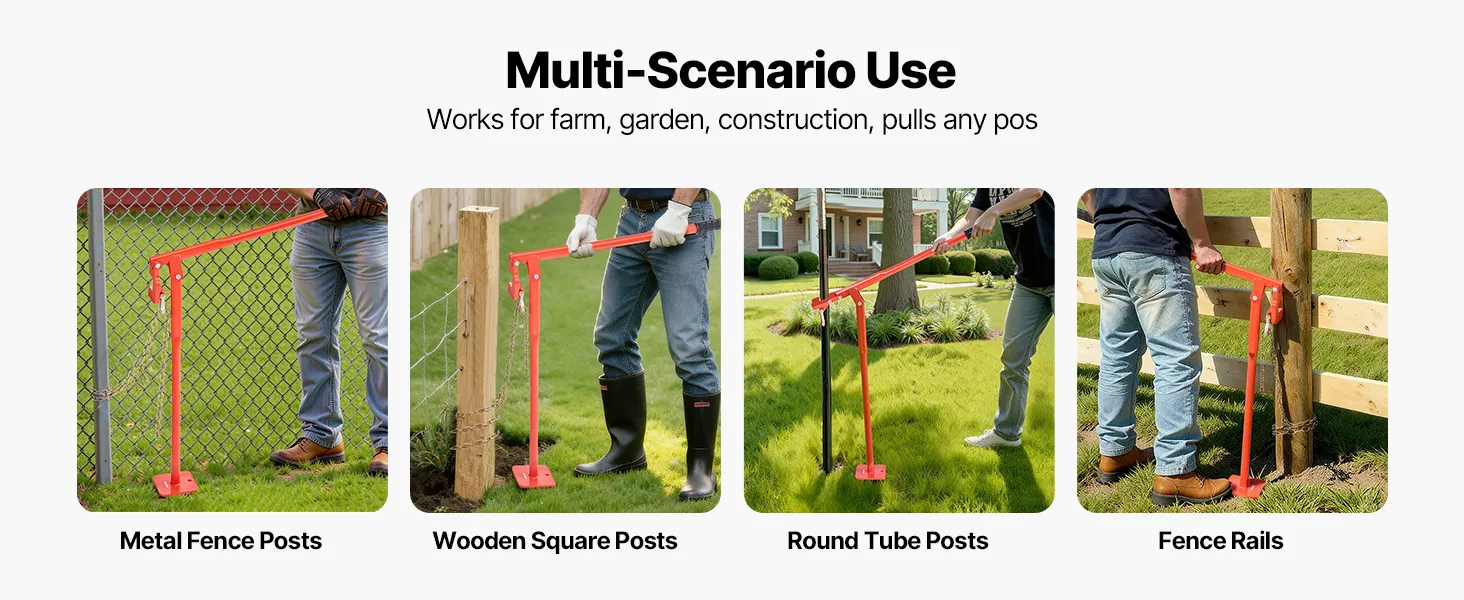 Ta szybka wyciągarka do słupków idealnie nadaje się do stosowania w gospodarstwach rolnych, ogrodach i na placach budowy, umożliwiając bezproblemowe wyciąganie metalowych słupków ogrodzeniowych, drewnianych i kwadratowych. Jedno narzędzie wykonuje wiele zadań bez użycia prądu, zapewniając wydajną i wygodną obsługę.