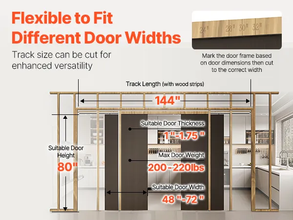 Zestaw ościeżnic do drzwi przesuwnych VEVOR do drzwi o szerokości 1219–1829 mm i wysokości 2032 mm, zestaw drzwi przesuwnych ze stali ocynkowanej i drewna z dwukierunkowym mechanizmem cichego zamykania i płynnym przesuwaniem, do salonu