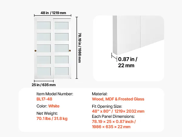 Oszczędzające miejsce drzwi przesuwne: Wymiary każdego skrzydła: 25 cali / 635 mm (szer.) x 78,19 cala / 1986 mm (wys.), grubość: 0,87 cala / 22 mm. Pasują do otworów drzwiowych o wymiarach 48 x 80 cali / 1219 x 2032 mm. Drzwi przesuwne nie wymagają dodatkowej powierzchni do otwierania, dzięki czemu zajmują wyjątkowo mało miejsca – idealne do małych mieszkań, szaf i garderób.