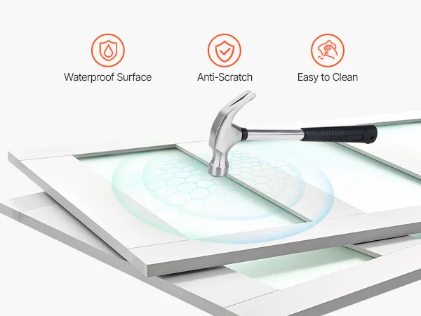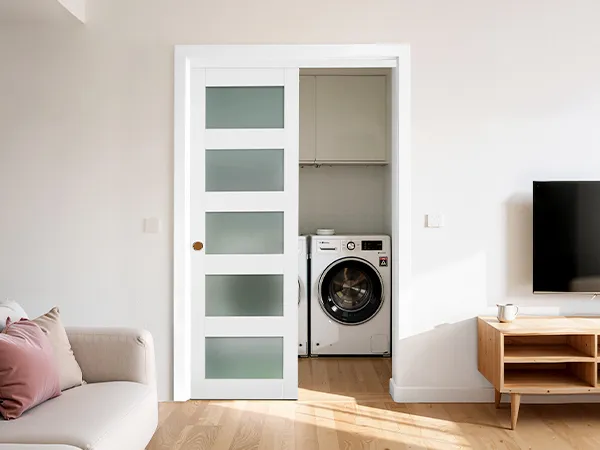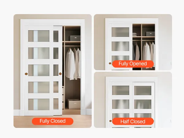 Wytrzymałe i trwałe: Nasze panele drzwi przesuwnych, wykonane z litego drewna i płyty MDF, oferują doskonałą stabilność i trwałość. Wodoodporna powierzchnia z tworzywa PVC jest łatwa w czyszczeniu, a 5-częściowe hartowane szkło matowe jest odporne na zarysowania i stłuczenia, zapewniając dostęp naturalnego światła i jednocześnie chroniąc prywatność.