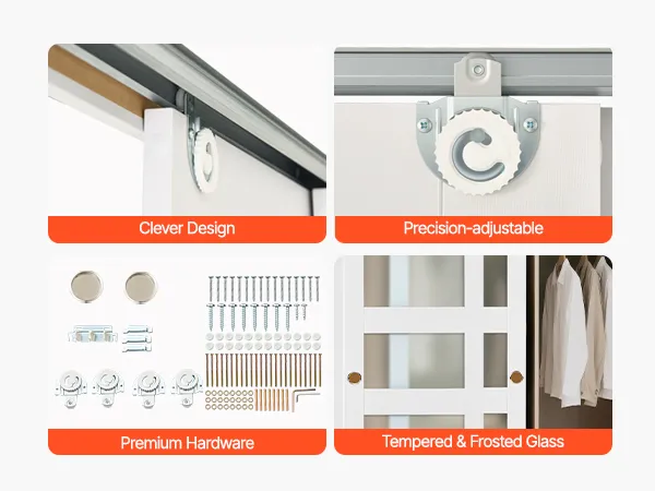 Łatwy montaż: Zestaw zawiera dwoje drzwi przesuwnych i kompletny zestaw montażowy. Wystarczy zamontować panel drzwi, złożyć panele szklane, zainstalować zestawy montażowe i zawiesić drzwi. W mgnieniu oka uzyskasz funkcjonalny i stylowy system drzwi przesuwnych.