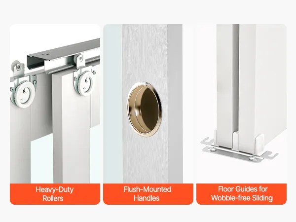 Ciche i płynne przesuwanie: Dzięki zastosowaniu ponad 100 000 łożysk przetestowanych na rolkach, wysokiej jakości stalowych okuć, trwałych prowadnic i rolek drzwiowych, solidnych zawiasów oraz prowadnic podłogowych zapobiegających kołysaniu się paneli, nasze podwójne drzwi przesuwne zapewniają ciche i płynne przesuwanie.