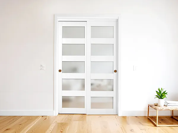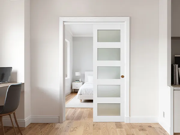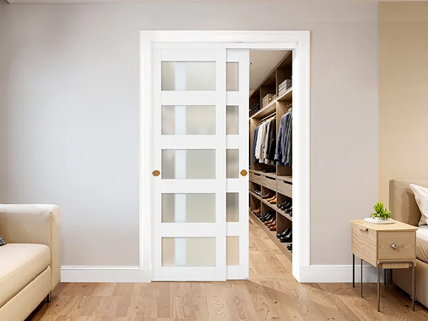 Nasze przesuwne drzwi do szafy, z solidną drewnianą ramą, wodoodpornym wykończeniem i pięcioma taflami hartowanego, matowego szkła, przesuwają się płynnie i oszczędzają miejsce. Każdy panel drzwi ma wymiary 635 mm (szerokość) x 1986 mm (wysokość) i grubość 22 mm. Pasują do otworów drzwiowych o wymiarach 1219 x 2032 mm.