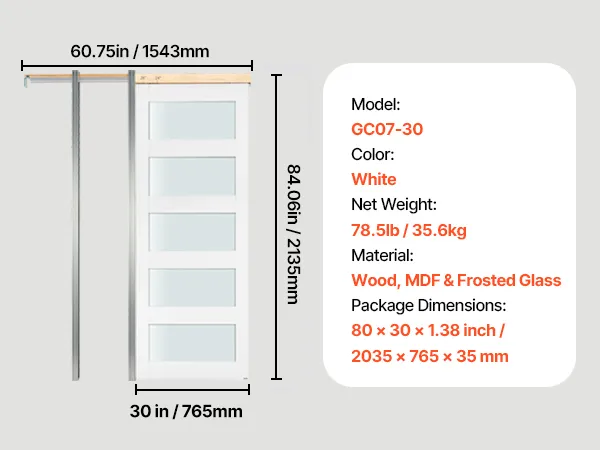 Wymiary drzwi: Rozmiar panelu drzwi: 30 cali / 765 mm (szer.) x 80 cali / 2035 mm (wys.), 1,38 cala / 3,5 cm (grubość). Pasuje do otworów o wymiarach 61 x 84,5 cala. W zestawie znajdują się jedne drzwi przesuwne i kompletny zestaw montażowy.