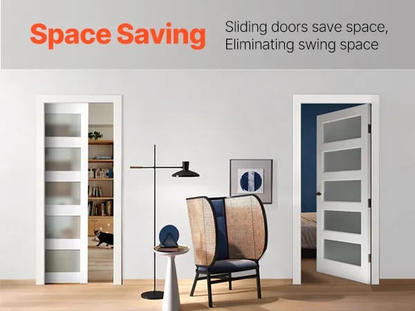Innowacyjny design: Dzięki unikalnej konstrukcji w ścianie i ukrytemu montażowi, te drzwi przesuwne oszczędzają mnóstwo miejsca, nie wymagając żadnej przestrzeni na zawiasy. W przeciwieństwie do drzwi składanych i drzwi stodołowych, które zajmują dużo miejsca w pionie i poziomie, nasze drzwi przesuwne maksymalizują efektywność wykorzystania przestrzeni.