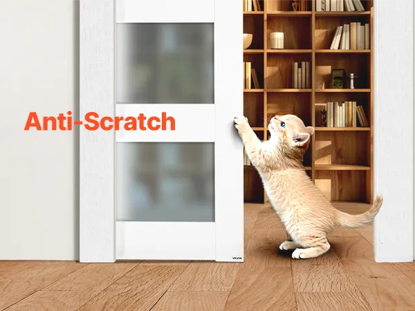 Ciche i płynne przesuwanie: Wyposażone w ponad 100 000 łożysk przetestowanych na rolkach, wysokiej jakości stalowe okucia, zawieszenie trójkołowe oraz wytrzymałe prowadnice i szyny, nasze drzwi przesuwne przesuwają się cicho i płynnie. Łatwo się przesuwają i ciągną, zapobiegając uderzeniom i kolizjom, a jednocześnie chroniąc ściany przed uszkodzeniami.