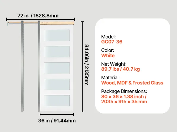Wymiary drzwi: Rozmiar panelu drzwi: 36 cali / 915 mm (szer.) x 80 cali / 2035 mm (wys.), grubość: 1,38 cala (35 mm). Pasuje do otworów o wymiarach 1854,2 x 2146,3 mm. Zestaw zawiera jedne drzwi przesuwne i kompletny zestaw montażowy.