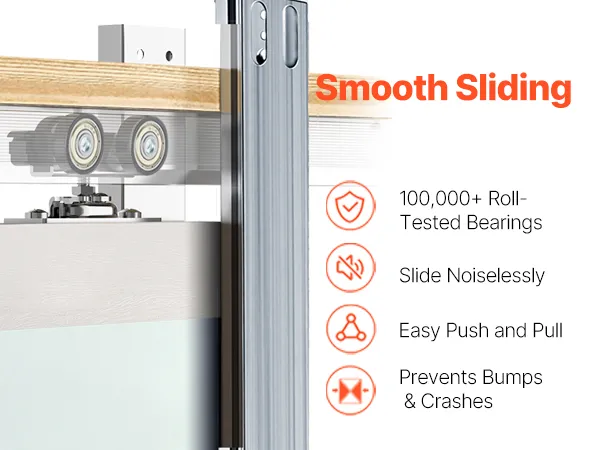 Ciche i płynne przesuwanie: Wyposażone w ponad 100 000 łożysk przetestowanych na rolkach, wysokiej jakości stalowe okucia, zawieszenie trójkołowe oraz wytrzymałe prowadnice i szyny, nasze drzwi przesuwne przesuwają się cicho i płynnie. Łatwo się przesuwają i ciągną, zapobiegając uderzeniom i kolizjom, a jednocześnie chroniąc ściany przed uszkodzeniami.