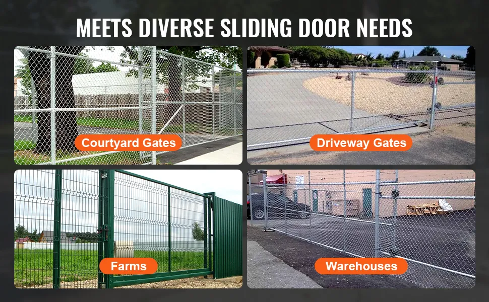 Kompatybilność z wieloma ościeżnicami: Ten system okuć do bram przesuwnych nadaje się do różnych typów drzwi przesuwnych, w tym do drzwi tarasowych, podjazdów, bram wjazdowych i magazynów. Pasuje do ościeżnic o różnych rozmiarach i nie wymaga regulacji. Montaż jest szybki i łatwy, zapewniając większą elastyczność i wygodę.