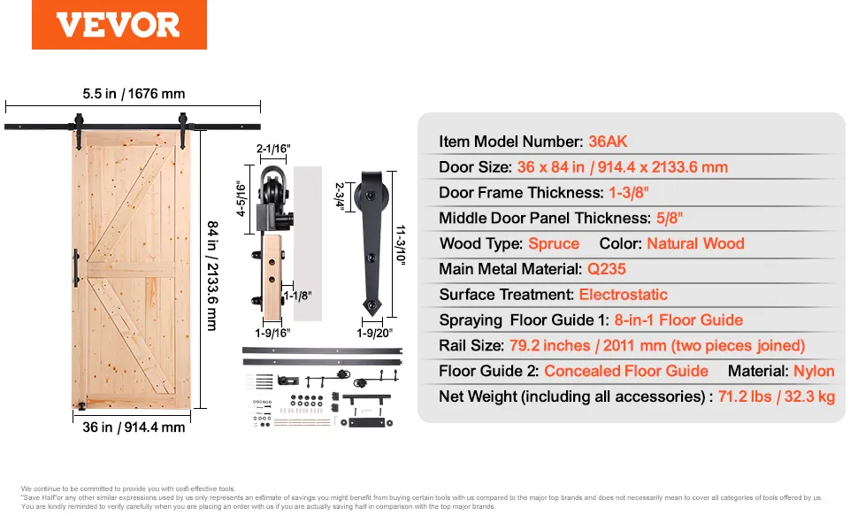 Drzwi do stodoły VEVOR są wykonane z najwyższej jakości drewna świerkowego. Są trwałe i wytrzymują codzienne użytkowanie. Drewno jest mocne i wygląda jak najwyższej jakości. Ich panelowa konstrukcja dodaje charakteru. Te drzwi to trwała opcja dla Twojego domu. Dołączone okucia są również najwyższej jakości. Zapewniają płynne i ciche przesuwanie drzwi. Materiały te gwarantują długotrwałą wydajność. Nasze drzwi do stodoły staną się niezawodną częścią Twojego domu. Inwestycja zwróci się pod względem stylu i funkcjonalności.
