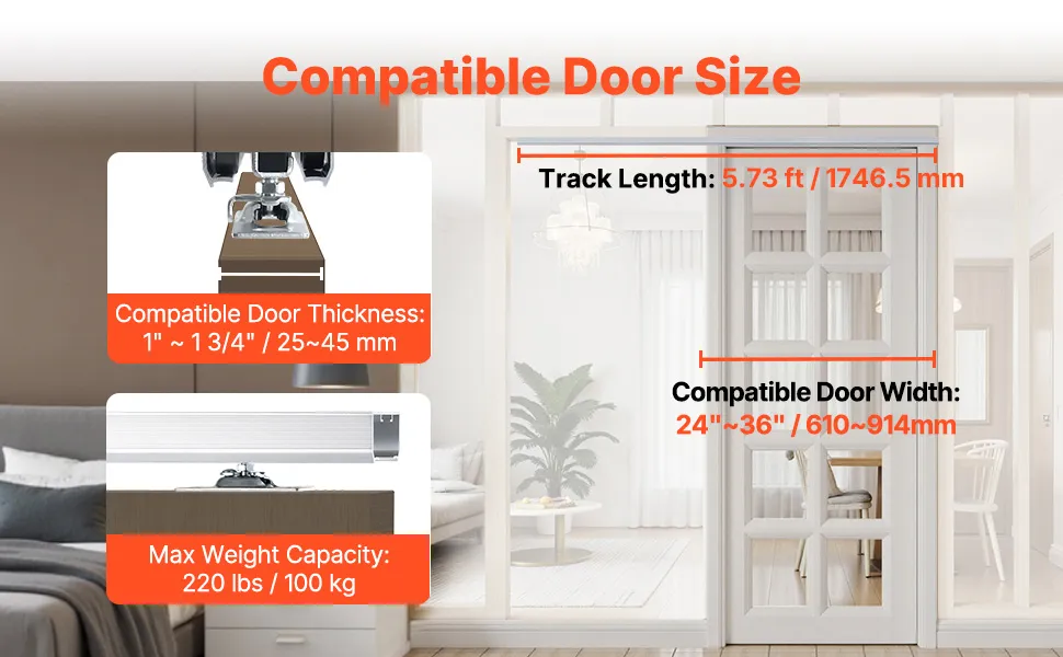 Ten zestaw okuć do drzwi przesuwnych o długości 1746 mm jest odpowiedni do drzwi o grubości od 25 do 45 mm i szerokości od 610 do 914 mm. Jego maksymalne obciążenie wynosi 100 kg. Możesz wybrać rozmiar odpowiadający Twoim potrzebom.
