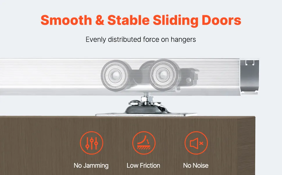 Stabilność i płynność: Zestaw drzwi przesuwnych zawiera trzy kółka, które równomiernie rozkładają ciężar drzwi na każde kółko. Wytrzymałe łożyska kulkowe minimalizują tarcie i zapewniają cichy, płynny i stabilny ruch drzwi.