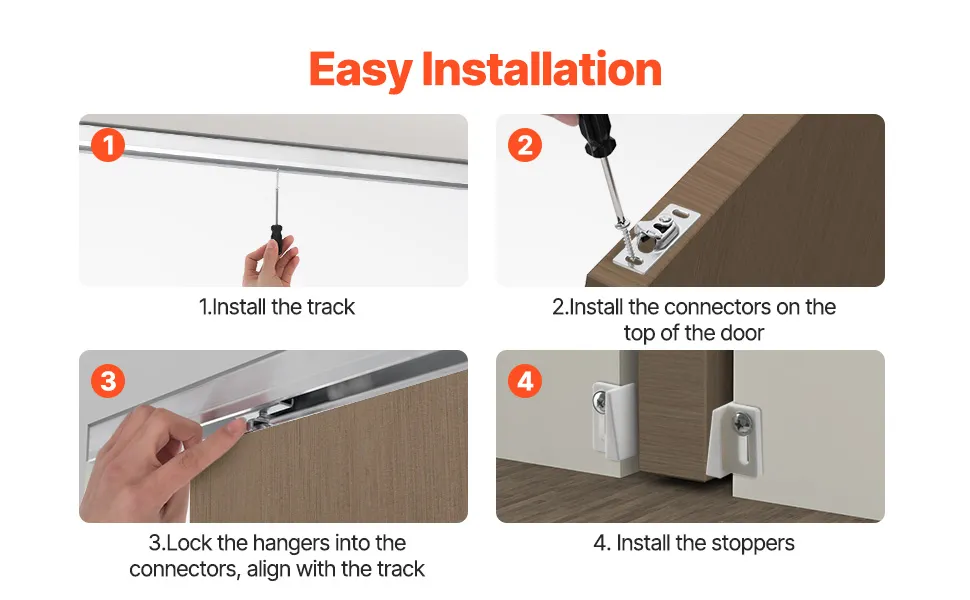 Łatwy montaż: Zestaw prowadnic do drzwi przesuwnych charakteryzuje się prostą konstrukcją i płytkami szybkiego montażu, co ułatwia montaż i demontaż drzwi, oszczędzając czas i wysiłek. Nawet użytkownicy bez doświadczenia zawodowego mogą go z łatwością zamontować, postępując zgodnie z instrukcją.