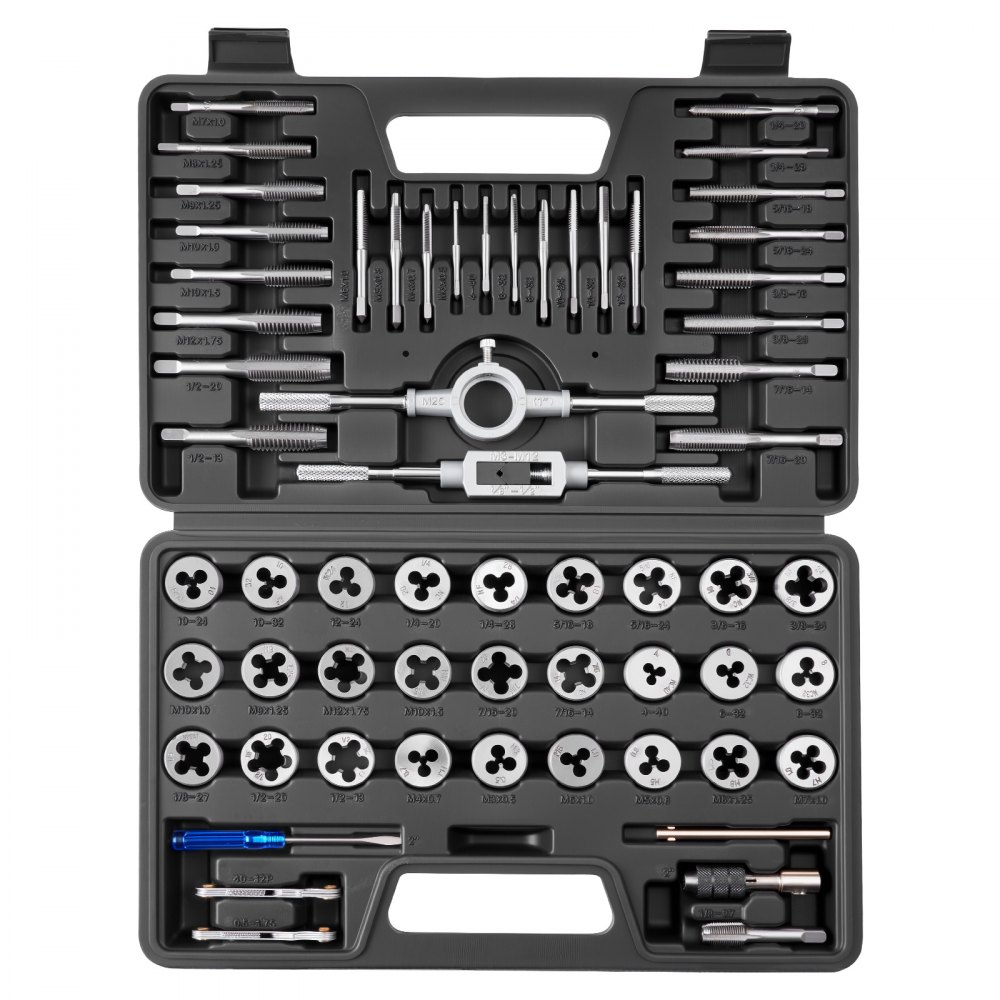 Zestaw gwintowników i narzynek VEVOR, 60 elementów, rozmiary metryczne i SAE M3 do M12, od nr 4 do 1/2 cala, z gwintownikami i narzynkami zgrubnymi i drobnymi, kluczem i walizką transportową Zestaw gwintowników i narzynek VEVOR, 60 elementów, rozmiary metryczne i SAE M3 do M12, od nr 4 do 1/2 cala, z gwintownikami i narzynkami zgrubnymi i drobnymi, kluczem i walizką transportową