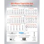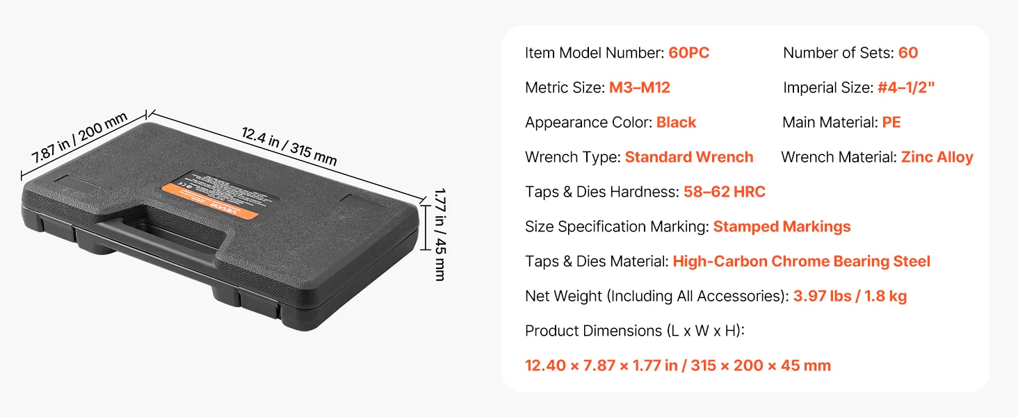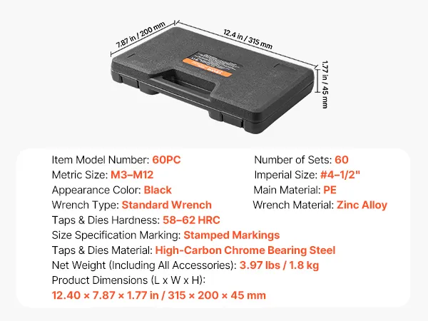 Zestaw gwintowników i narzynek VEVOR, 60 elementów, rozmiary metryczne i SAE M3 do M12, od nr 4 do 1/2 cala, z gwintownikami i narzynkami zgrubnymi i drobnymi, kluczem i walizką transportową