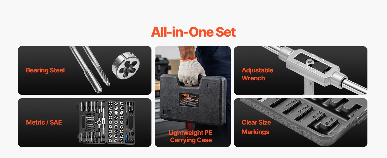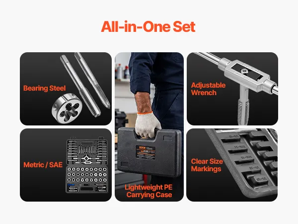 • 60-częściowy zestaw do nacinania gwintów SAE i metrycznych: Ten zestaw obejmuje typowe zadania związane z nacinaniem gwintów wewnętrznych i zewnętrznych. Nadaje się zarówno do nacinania nowych gwintów, jak i do naprawy gwintów uszkodzonych. Ponieważ wszystkie elementy są zawarte w zestawie, nie jest wymagany żaden dodatkowy zestaw narzędzi.