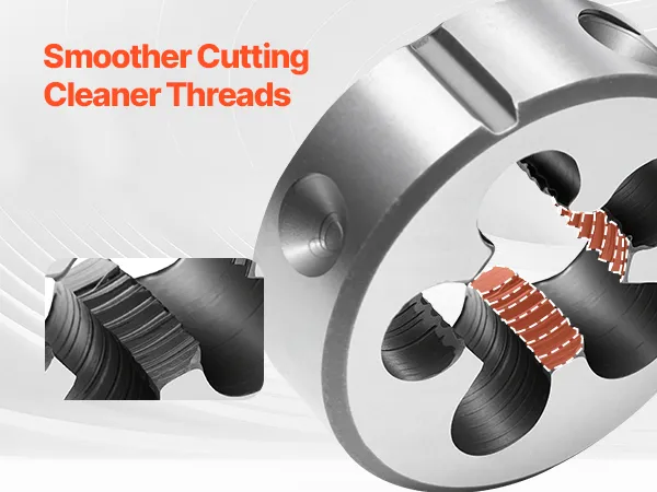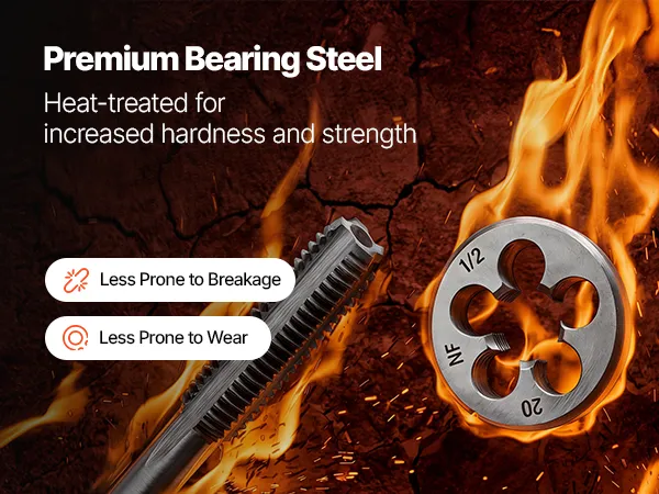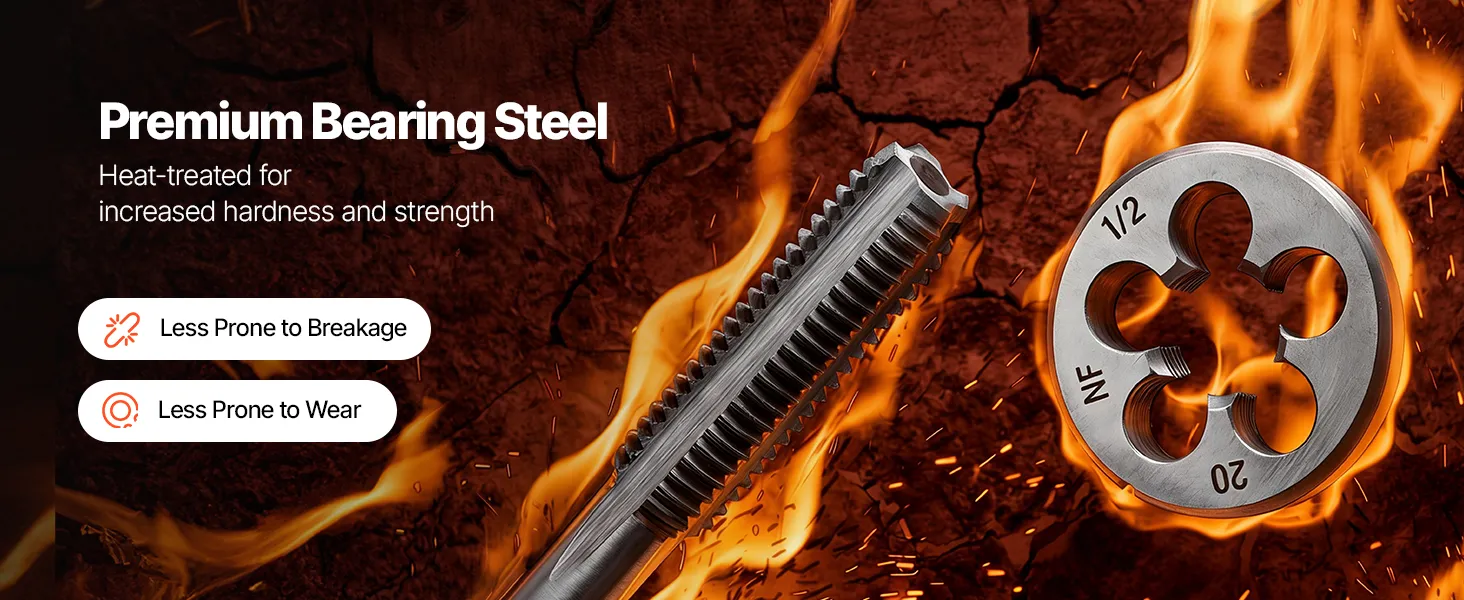 • Wykonanie ze stali łożyskowej: Wykonany z wysokiej jakości stali łożyskowej i poddany obróbce cieplnej w temperaturze 800°C (1472°F), zestaw charakteryzuje się wysoką twardością i odpornością na zużycie. Umożliwia to trwałe, wysokoczęstotliwościowe nacinanie gwintów.