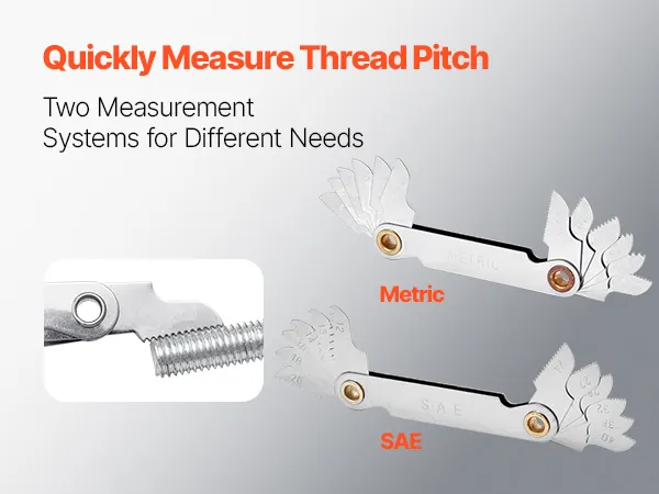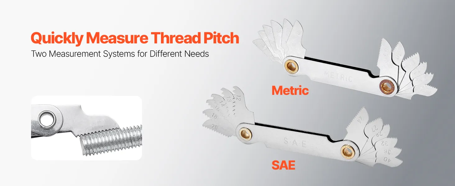 Ten zestaw do gwintowania zawiera sprawdziany do gwintów SAE i metryczne. Pozwala to na szybki i precyzyjny pomiar skoku gwintu. Gwinty można również łatwo zidentyfikować po ich rozmiarze i profilu.