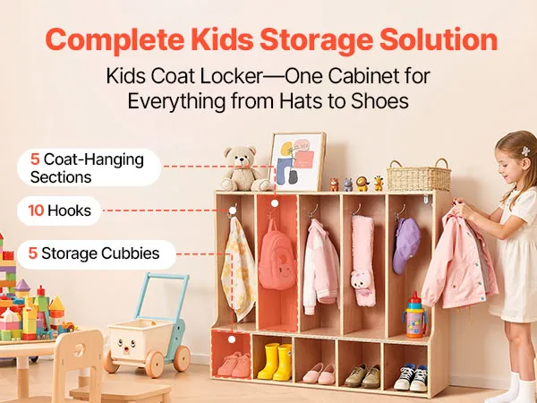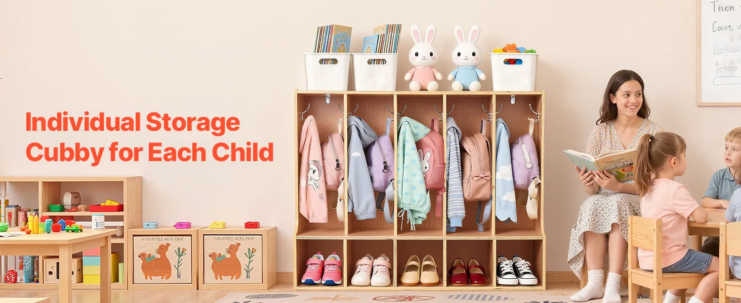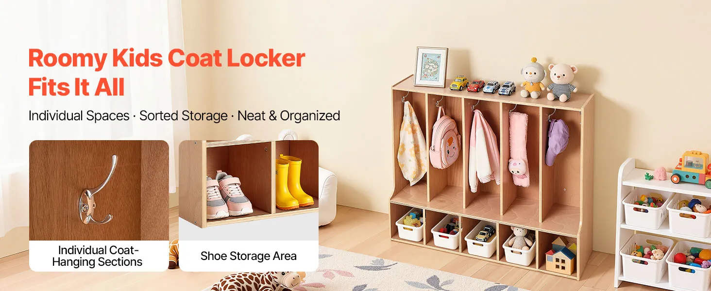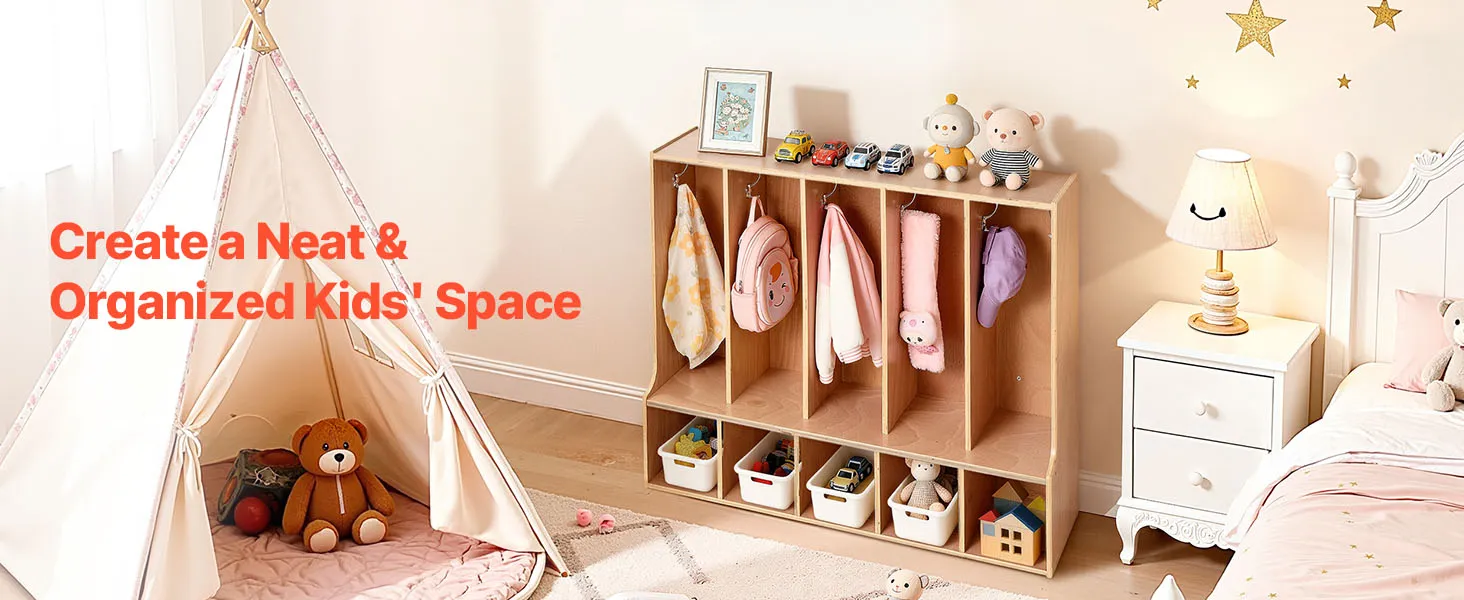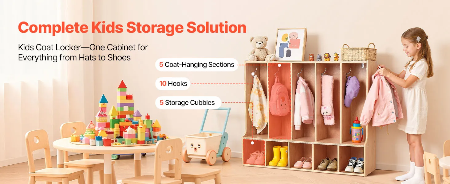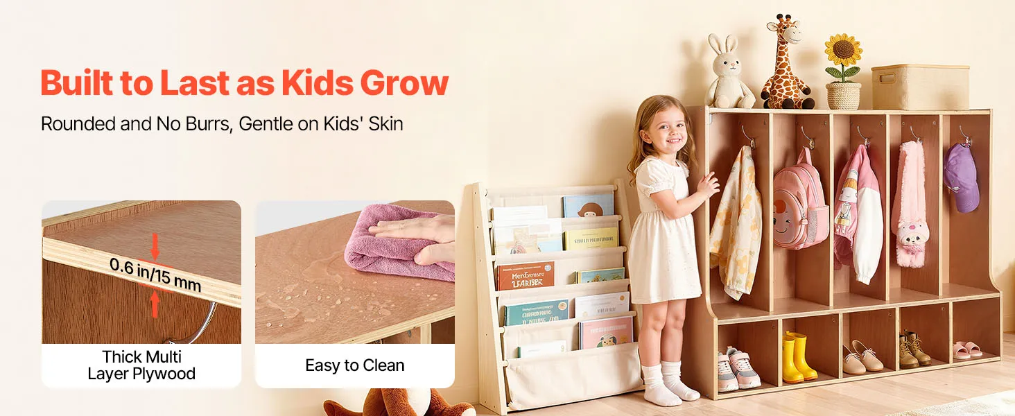 VEVOR Otwarta szafa dziecięca wykonana ze sklejki, szafa dziecięca z 10 haczykami i 10 przegródkami (5 dużych + 5 małych), półka do przechowywania i szafa do pokoju dziecięcego, domu, przedszkola, żłobka