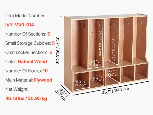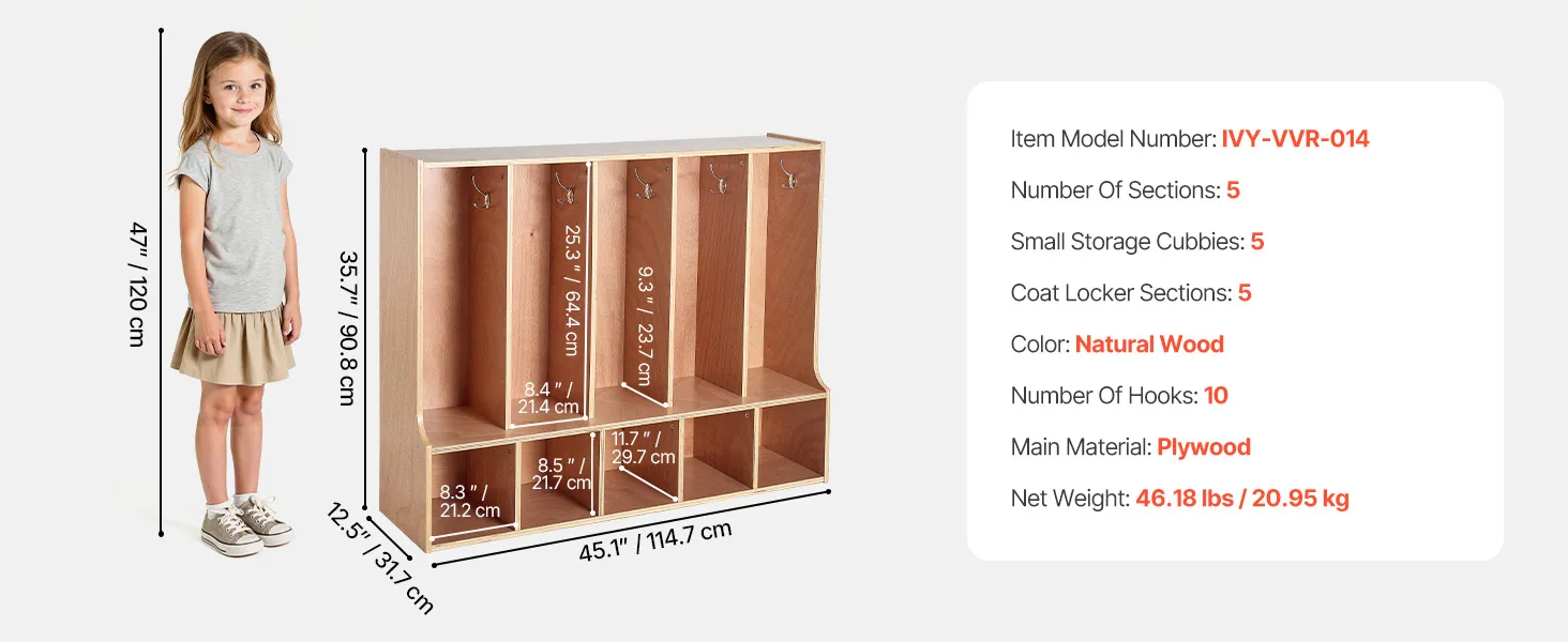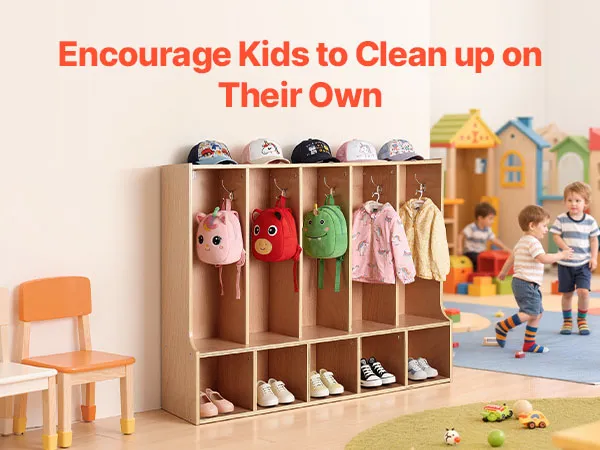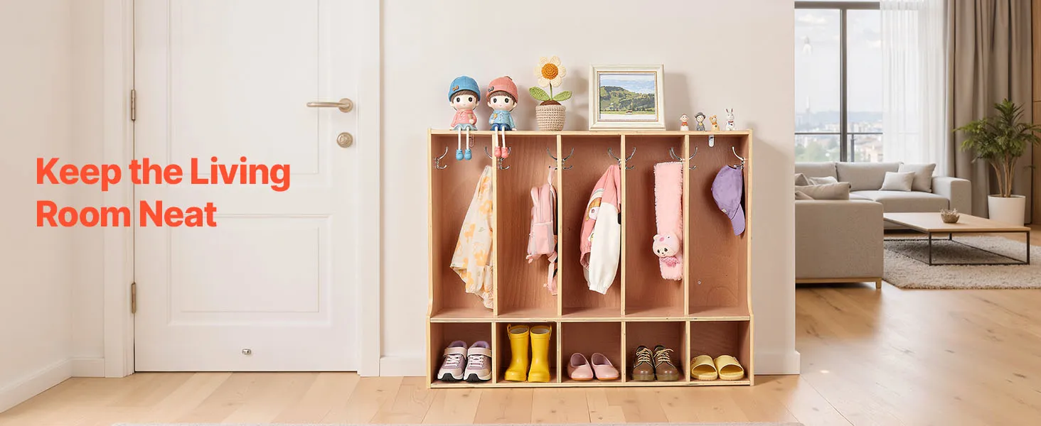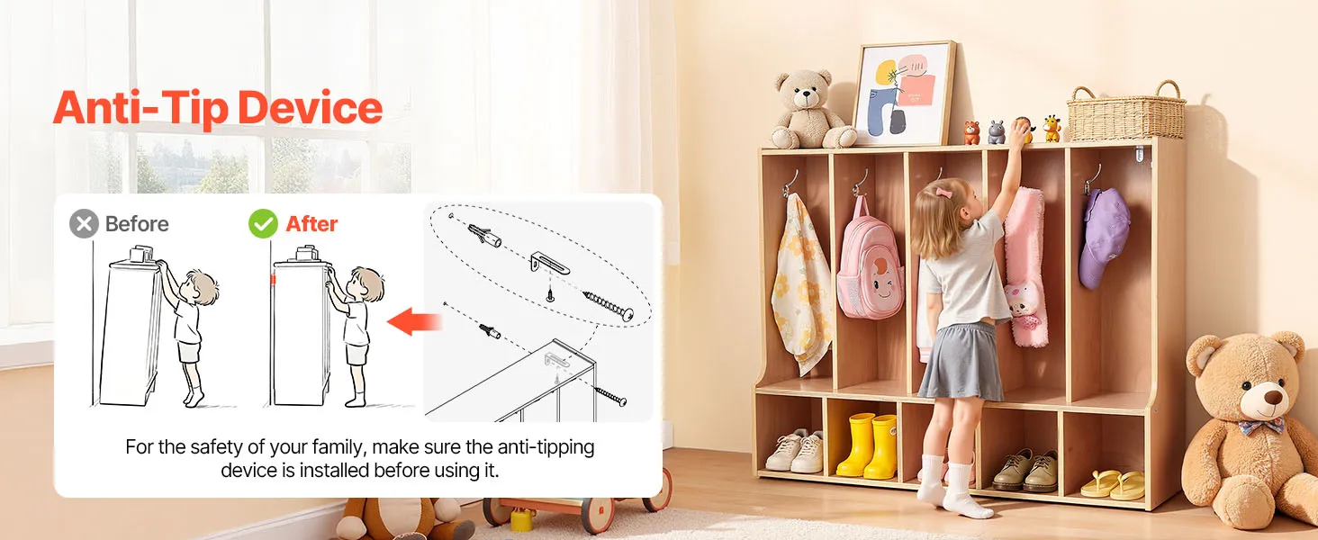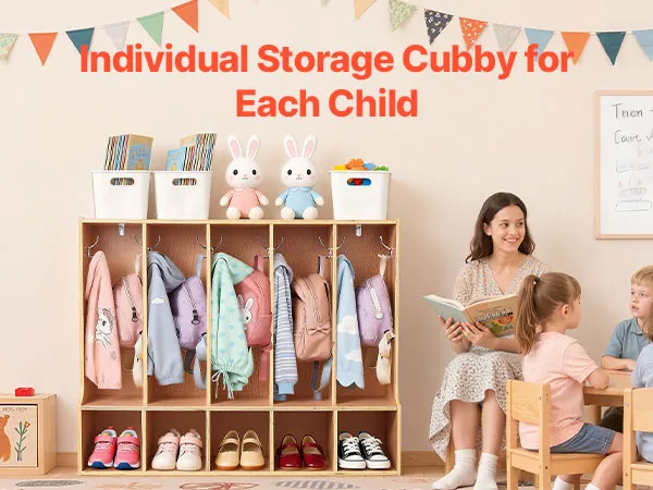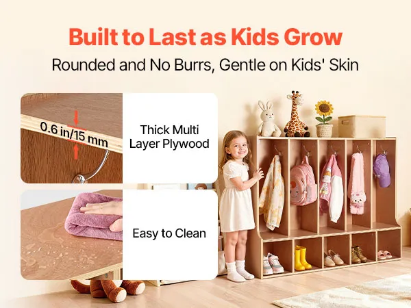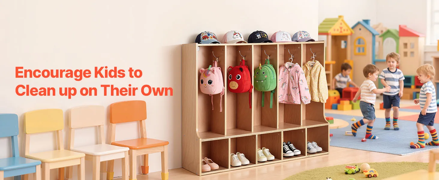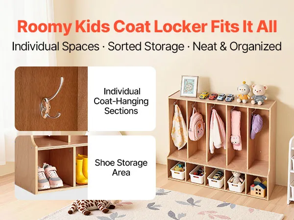 VEVOR Otwarta szafa dziecięca wykonana ze sklejki, szafa dziecięca z 10 haczykami i 10 przegródkami (5 dużych + 5 małych), półka do przechowywania i szafa do pokoju dziecięcego, domu, przedszkola, żłobka