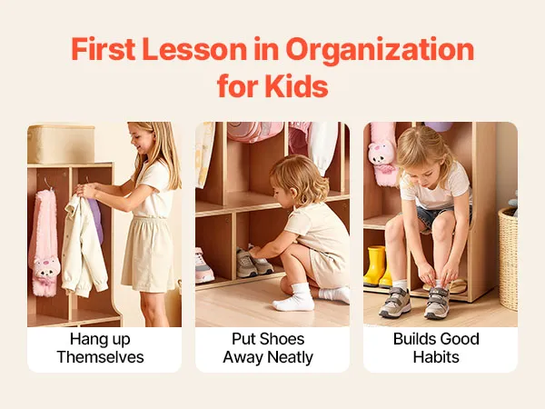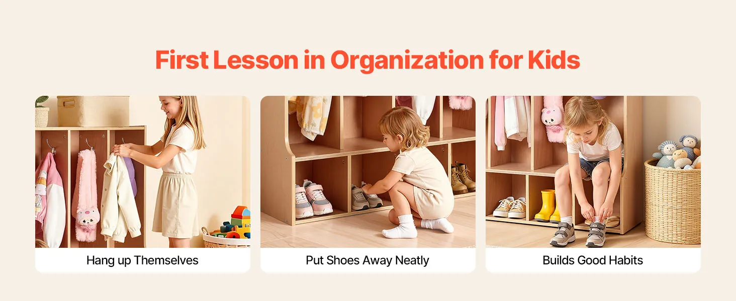 Zaprojektowana specjalnie dla dzieci: Ta szafa dla maluchów idealnie sprawdzi się w domu, żłobku, szkole i przedszkolu, oferując mnóstwo miejsca na kurtki, buty, plecaki i przybory szkolne. Idealnie sprawdzi się w pokojach zabaw, na placach zabaw lub w klasach, zaspokajając codzienne potrzeby związane z przechowywaniem.