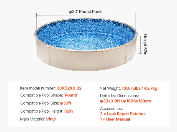 Pasuje do basenów o średnicy 33 stóp / 1006 cm: Nasza wykładzina basenowa została zaprojektowana specjalnie do okrągłych basenów o średnicy 33 stóp / 1006 cm z płaskim dnem i wysokością ścianki do 52 cali / 132 cm, co gwarantuje dokładne i bezpieczne dopasowanie do Twojego basenu.