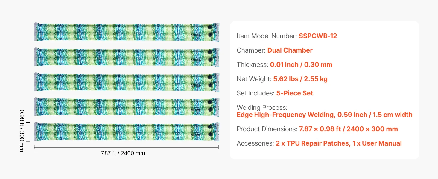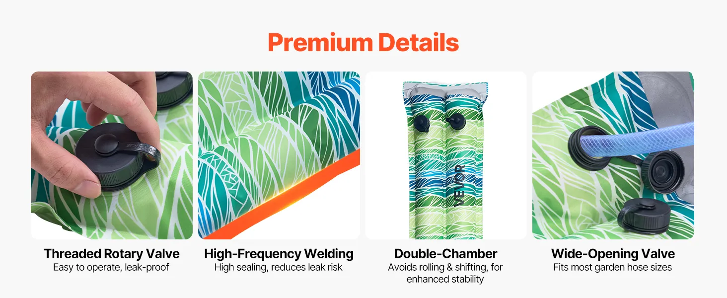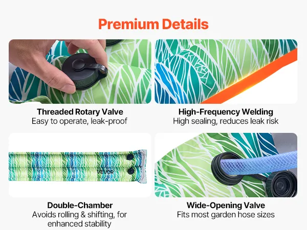 Wyposażony w wewnętrzny zawór wkręcany, zapewniający płynną i szczelną pracę. Szeroki otwór pasuje do większości węży ogrodowych, umożliwiając szybkie napełnianie. Zgrzewane szwy o szerokości 1,5 cm z zastosowaniem wysokiej częstotliwości zapewniają szczelne uszczelnienie, a dwukomorowa konstrukcja zapobiega zwijaniu się i przesuwaniu, zapewniając dodatkową stabilność.