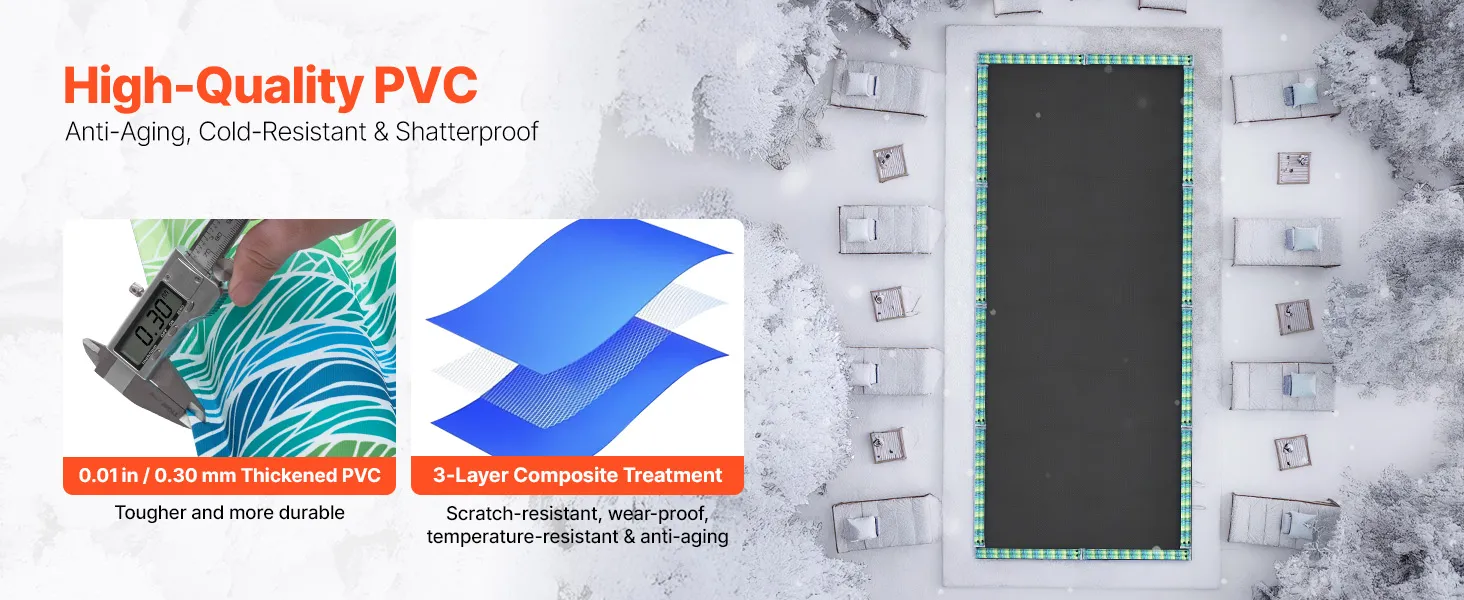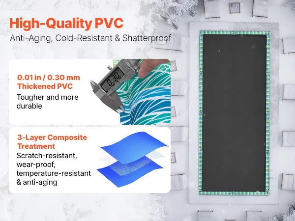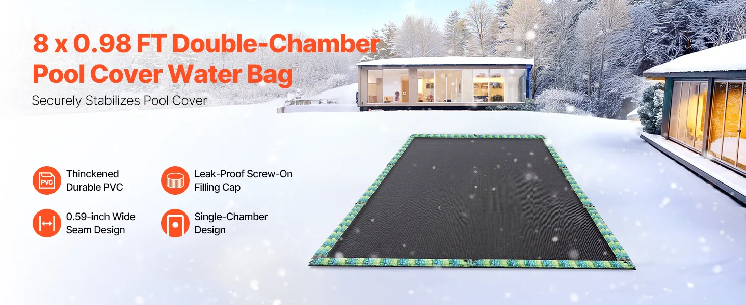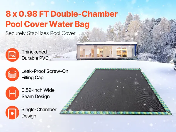 Gruby i wytrzymały materiał PVC: Te zimowe worki obciążeniowe wykonane ze wzmocnionego, elastycznego PVC o grubości 0,3 mm (TBC) są odporne na uderzenia, działanie promieni słonecznych i ścieranie. Po napełnieniu tworzą niezawodną barierę obciążeniową, która utrzymuje pokrywę basenową na miejscu. Aby zapewnić optymalną wydajność, napełnij je do 50-70% ich pojemności, aby umożliwić rozszerzanie się w ujemnych temperaturach.
