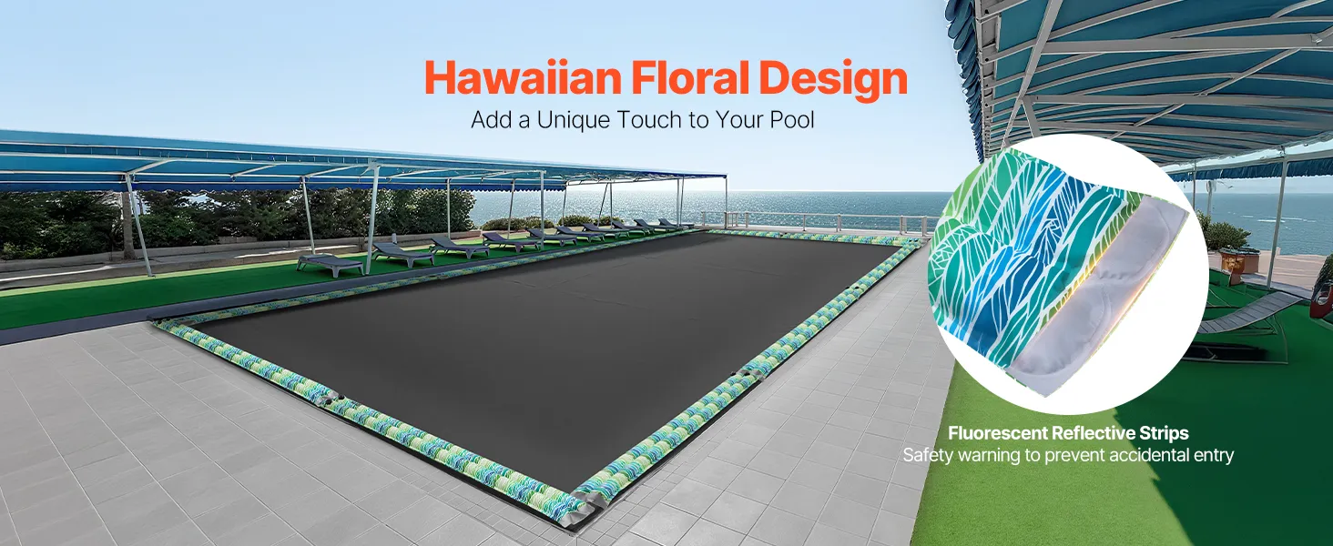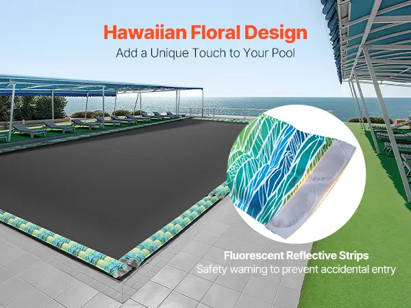 Nasze zimowe przykrycia basenowe z tropikalnym, hawajskim nadrukiem dodadzą Twojemu basenowi wyrazistego akcentu. Odblaskowe paski na rogach zapewniają dobrą widoczność o zmierzchu lub przy słabym oświetleniu, zapewniając dodatkowe bezpieczeństwo wokół basenu.