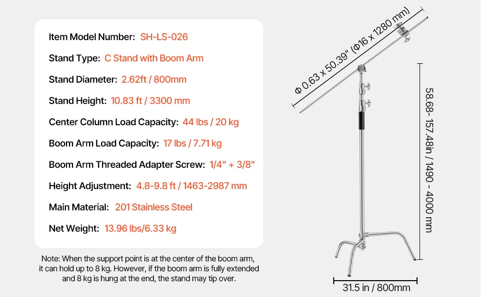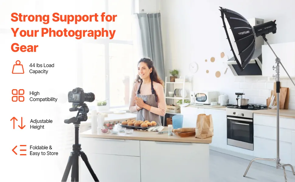 Ten statyw typu C jest wyposażony w uniwersalny adapter z gwintem 1/4 cala i 3/8 cala i obsługuje reflektory wideo, softboxy i inne. Nośność kolumny środkowej wynosząca 19 kg (44 funty), nośność ramienia wysięgnika wynosząca 8 kg (17 funtów) i regulowana wysokość od 14,7 m (4,8 stopy) do 3,9 m (9,8 stopy) pozwalają na łatwe uchwycenie obrazu z każdej perspektywy.