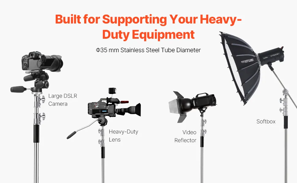 Maksymalne obciążenie 44 funtów (20 kg): Wykonany z trwałej stali nierdzewnej, ten solidny statyw oświetleniowy jest przeznaczony do podtrzymywania ciężkiego sprzętu o udźwigu 44 funtów (20 kg) na kolumnie środkowej i udźwigu 17 funtów (8 kg) na ramieniu wysięgnika. Wykonana ze stali nierdzewnej, odpornej na korozję, wytrzymuje wilgoć, wysokie temperatury i wstrząsy.