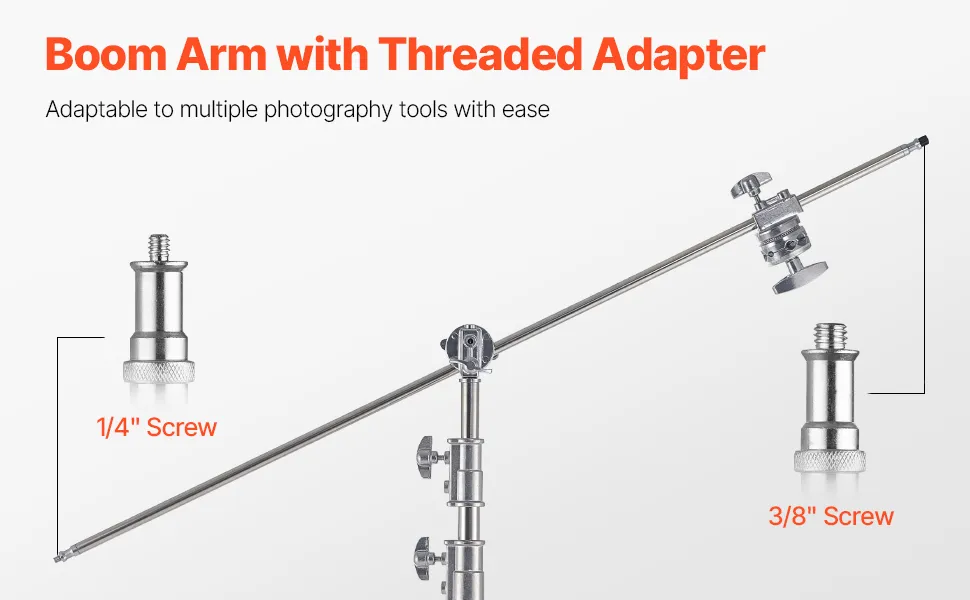 Kompatybilny z różnorodnym sprzętem fotograficznym: Kolumna środkowa posiada uniwersalny adapter, a ramię wysięgnika ma adaptery gwintowane 1/4 cala i 3/8 cala. Zapewnia to kompatybilność z większością sprzętu fotograficznego, takiego jak reflektory studyjne, softboxy, zestawy sufitowe i pojedyncze światła