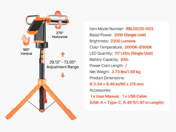 Lampa budowlana LED VEVOR ze statywem, lampa kempingowa z akumulatorem 6 Ah, z 3 głowicami, odłączanym statywem, 2200 LM, 3000 K-6500 K, z możliwością ściemniania, oświetlenie placu budowy