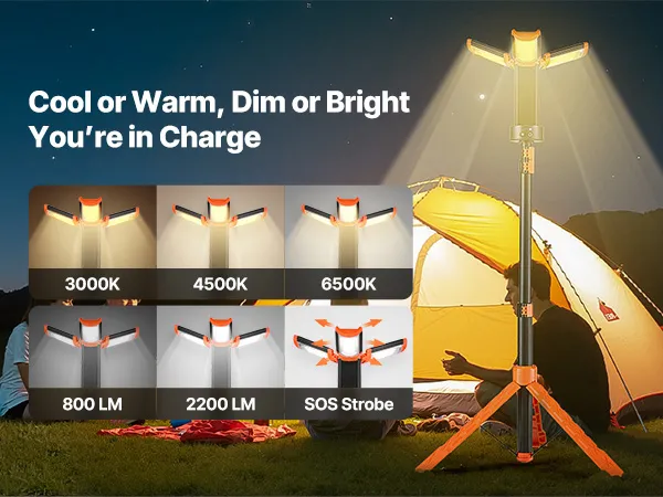 Oświetlenie szerokokątne: Ta lampa robocza LED ze stojakiem umożliwia regulację jasności i temperatury barwowej (3000-6500 K), od ciepłej do zimnej. Idealna do napraw w garażu lub przyjęć w ogrodzie, zapewniając niezbędne oświetlenie.