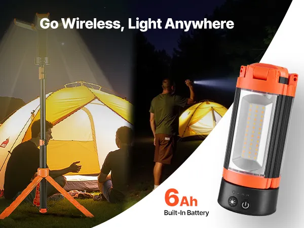 Akumulator o dużej pojemności: Ta bezprzewodowa lampa robocza jest wyposażona w akumulator 6 Ah, który umożliwia ciągłe oświetlenie bez konieczności podłączania do źródła zasilania. Zapewnia niezawodne źródło światła bez konieczności korzystania z gniazdek elektrycznych, idealne w przypadku przerw w dostawie prądu, na kempingu lub na placach budowy bez dostępu do prądu.