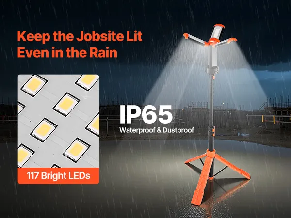 Nasza bezprzewodowa lampa robocza jest wodoodporna i pyłoszczelna zgodnie z normą IP65. Wyposażona jest w 117 diod LED o wysokiej jasności, które zapewniają stabilną i jasną pracę nawet w deszczowe dni.