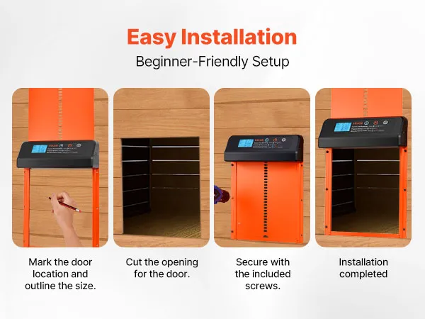 VEVOR Automatyczna klapka dla kurczaków, drzwi do kurnika z timerem, ręczną regulacją i zabezpieczeniem przed przytrzaśnięciem, otwieracz drzwi do kurnika, bramka do wybiegu dla kurczaków z wodoodporną uszczelką, pomarańczowy, 350 x 250 x 73 mm