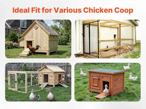 Elektryczne drzwi do kurnika pasują do kurników o konstrukcji ramowej, chodnikowych i wolnowybiegowych. Elastyczna konstrukcja dopasowuje się do różnych rozmiarów i układów, od przydomowych ogródków po małe gospodarstwa.