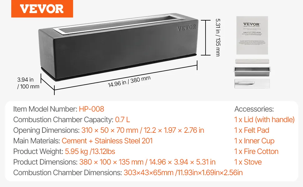 Kompaktowe i lekkie: To stołowe palenisko ma wymiary 380 x 100 x 135 mm / 14,96 x 3,94 x 5,31 cala i waży zaledwie 5,95 kg, dzięki czemu jest łatwe do przenoszenia i doskonale nadaje się do użytku na zewnątrz.