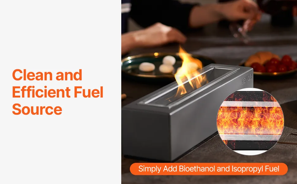 45–60 minut ciągłego palenia: Ten stół ogniowy wyposażony jest w komorę spalania o pojemności 0,7 litra, co umożliwia długotrwałe palenie i jest kompatybilny zarówno z bioetanolem, jak i alkoholem izopropylowym, które są łatwo dostępne w sklepach spożywczych, co zapewnia dodatkową wygodę.