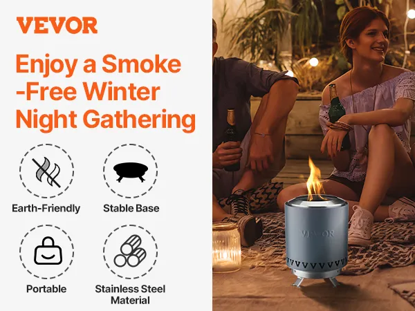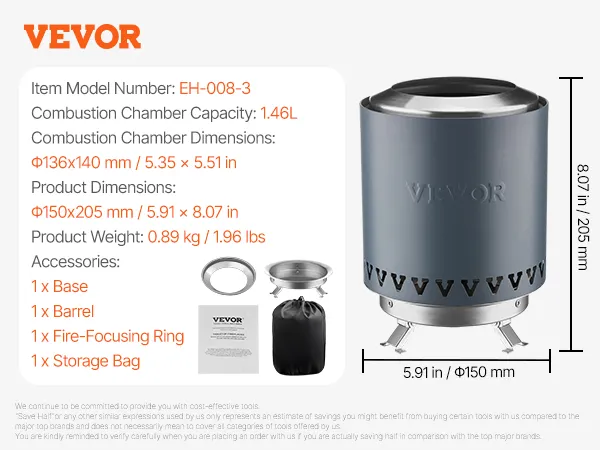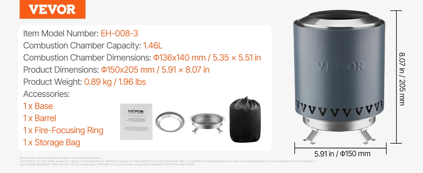 Kompaktowe i lekkie: Dzięki kompaktowej konstrukcji o wymiarach Φ5,91 x 8,35 cala (15 x 21,2 cm) i wadze zaledwie 1,96 funta (0,89 kg), to stołowe palenisko jest wyposażone w torbę do łatwego przenoszenia, dzięki czemu idealnie nadaje się do użytku na zewnątrz.