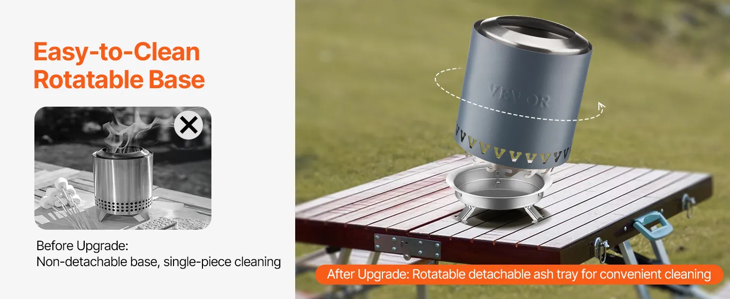 Stabilna konstrukcja: Palenisko stołowe charakteryzuje się stabilną konstrukcją z nisko położonym środkiem ciężkości, co zapewnia stabilność podczas użytkowania. Niezależnie od tego, czy postawisz je na stole, czy na podłodze, możesz z niego korzystać z pełnym spokojem. Pojemnik ze stali nierdzewnej gwarantuje trwałość i odporność na korozję, a ulepszona, zdejmowana podstawa ułatwia czyszczenie.