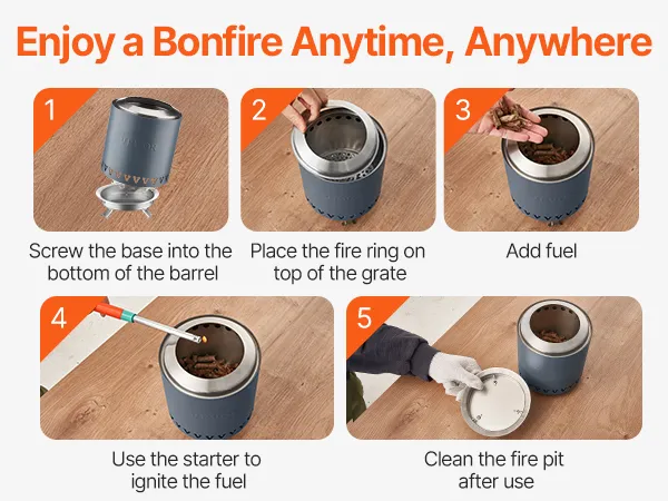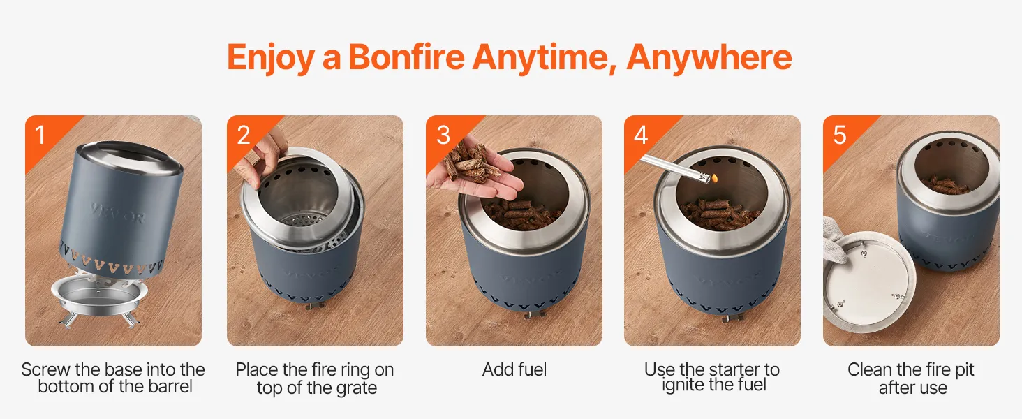 Ciesz się urokiem ogniska z tym stołowym paleniskiem! Wystarczy wsunąć pierścień paleniska w podstawę, dodać paliwo, podpalić zapalniczką i posprzątać po skończonym rozpaleniu – to takie proste!