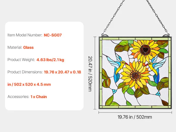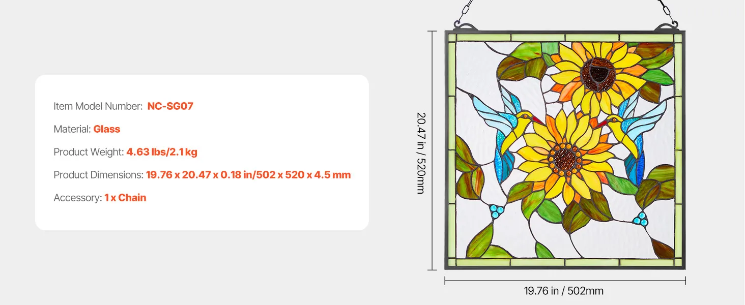 Panel witrażowy VEVOR (502 x 520 mm) wiszący witraż z łańcuchem, witraż w stylu Tiffany do zawieszenia, tradycyjny prostokątny, zabytkowy, rękodzielniczy wystrój okienny do kuchni i kościoła