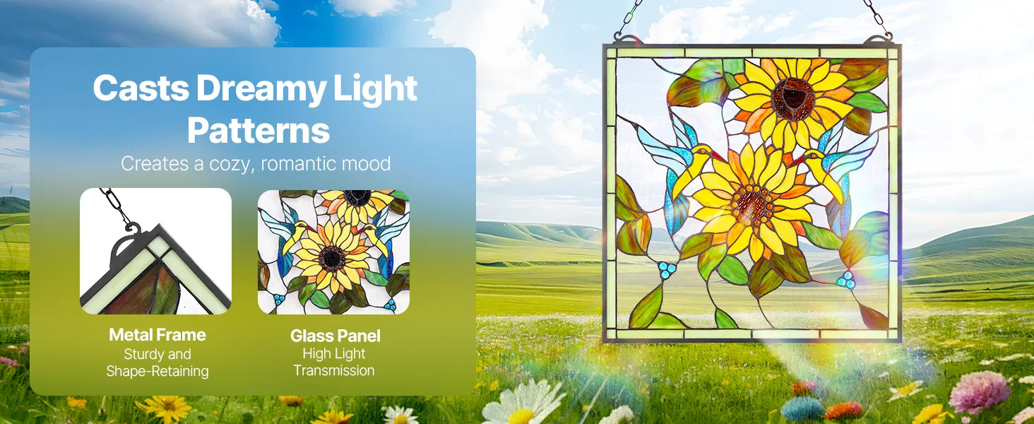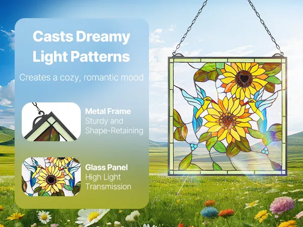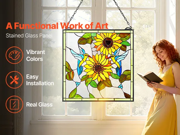 Trwała, żywa kolorystyka: Wykonany z połączenia tradycyjnych technik i nowoczesnej technologii, nasz wiszący panel witrażowy jest odporny na blaknięcie pod wpływem światła słonecznego i czyszczenia. Gładkie krawędzie szkła i solidne łączenia zapewniają piękno i trwałość.